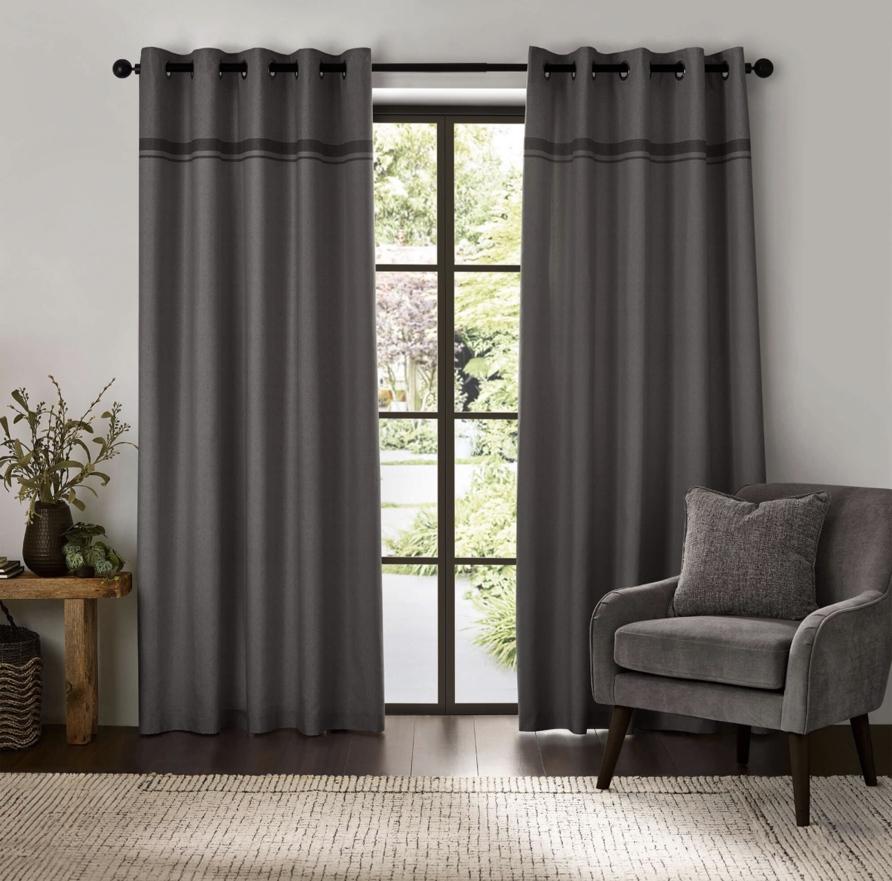 Curtains with metal rings at the top that slide directly onto a curtain rod.